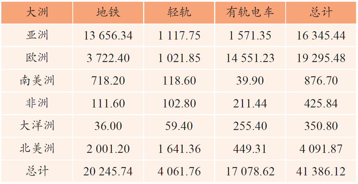 1. irudiak munduko kontinente nagusietan zehar hiriko trenbide-garraioaren eskala orokorra erakusten du (Oharra: Errusiako hiri guztiak Europan sailkatuta daude kalkulatzeko). Datuek adierazten dutenez, metroak eta tranbiak mundu mailan hiri-trenbide-garraio mota nagusiak dira, eta mundu-mailako hiri-garraioa Eurasian kontzentratzen dela batez ere, metroak Asiako herrialdeetan banatuta daude batez ere.[1]