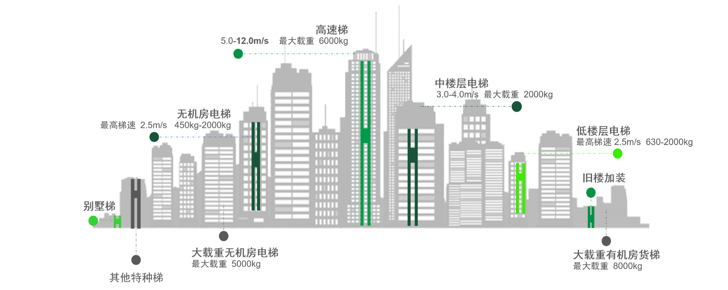 Trakzio-makina sorta zabala eskaintzen dugu eta bat datozen nabigazio nagusiak, 6.000 kg-ko gehienezko karga-gaitasuna (2:1 ratioa) eta 12 m/s-ko gehienezko abiadura (1:1 ratioa) duten aplikazio eszenatokietarako egokiak. Bezeroek zuzenean hauta ditzakete eredu egokiak igogailuaren parametroetan oinarrituta, diseinu-zikloa nabarmen laburtuz.