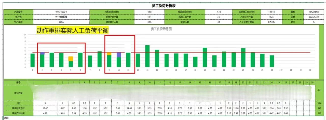 Langileen lan-karga tasa oinarrizko elementua da gaitasuna hobetzeko. Prozesuen arteko ziklo-denborak ez-koherenteak zirela eta, benetako irteera nahiko baxua zen. Aurreko lerroen orekatze hobekuntzetatik pilatutako esperientzia aprobetxatuz, ME sailak lidergoa hartu zuen produkzio lerroko langileen lan-karga orekatzeko tasa handitzeko ekimenak bultzatzeko. Prozesuak optimizatzeko ECRS printzipioa (Kendu, Konbinatu, Berrantolatu, Sinplifikatu) aplikatuz, langileen lan-kargaren oreka tasa % 82tik gora iritsi zen.
