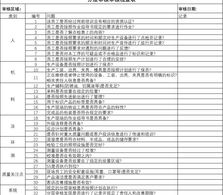 Ekimenaren hasierako fasean, "hiru betetze eta bi atxikimendu" sustatu ziren instalazio tailerreko goizeko bileretan, langileek kalitatea hobetzeko ahaleginetan aktiboki parte hartzera bultzatuz eta eragiketa prozesuan kalitatezko arriskuak salatzeko. Eraginkortasuna hobetzeko, dimentsio garrantzitsuak estaltzen dituzten kontrol zerrendak garatu ziren. Operadoreek beren posizioak hartu ondoren, batzuk ingurumenarekin ezagutzen ez direnak izan daitezke, eta maizago, baliteke ekoizpen gunean arazo potentzialak identifikatzea denbora gutxian ezaguera dela eta. Horrela, kontrol-zerrenden galderak egin behar dira lana aurrera eramateko.