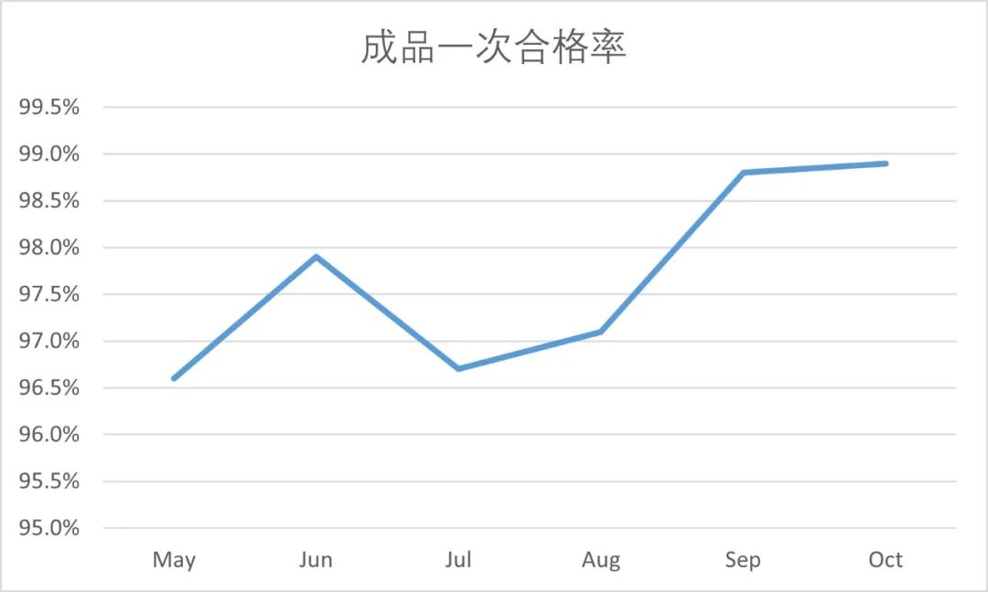 Kalitatearen hilabetearen hobekuntza ekimen hau ezartzearen bidez, langile guztien kalitatearen kontzientzia nabarmen hobetu da, eta kalitate adierazleak asko hobetu dira. Zehazki, 5m1eko "gizona" faktorearekin lotutako akatsak nabarmen murriztu dira; Instalazio falta, instalazio okerra eta instalazio mistoa nabarmen murriztu dira; Prozesu garrantzitsuetan kalitate arriskutsuak asko murriztu dira; eta prozesuen kalitatearen funtzionamendua etengabe optimizatu da. Ondorioz, lehen pasagunearen errendimendua eta produktu bukatuaren lehen mailako kualifikazio tasa% 1-2 igo da, eta bezeroen kexak eta produktuen itzulerak nabarmen murriztu dira. Datuetan hobekuntza nabarmen horiek hobekuntza ekimenaren eraginkortasuna eta balioa erakusten dute.